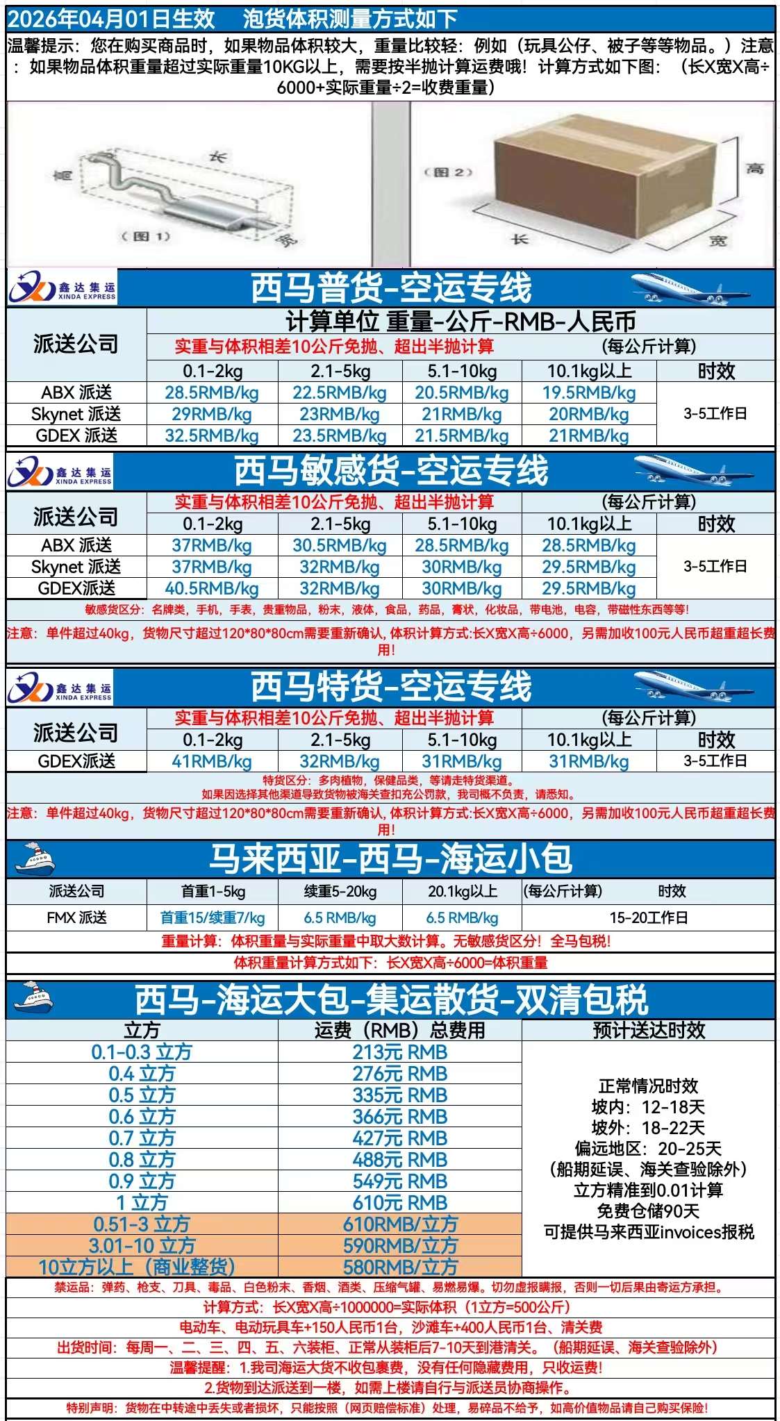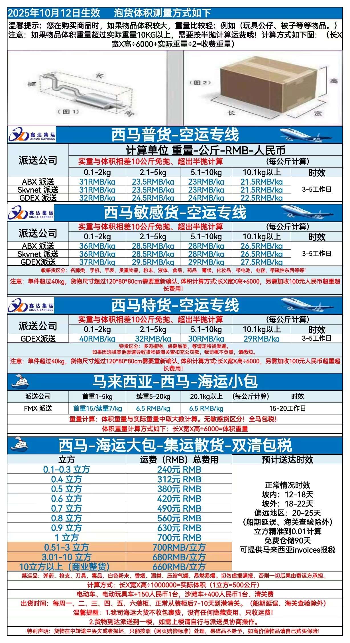 3.空运免抛体积重量10KG,超出则按半抛计算,计算方式例如:实际重量为15KG,尺寸为长60、宽60、高60CM即:体积重为:60X60X60CM÷6000=36KG(体积重量+实重÷2)=收费重量、半抛计算:(15+36÷2=25.5KG,则按26KG计费)